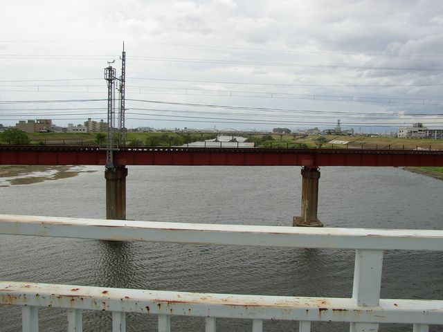 大和川。先に見える線路は近鉄柏原線。