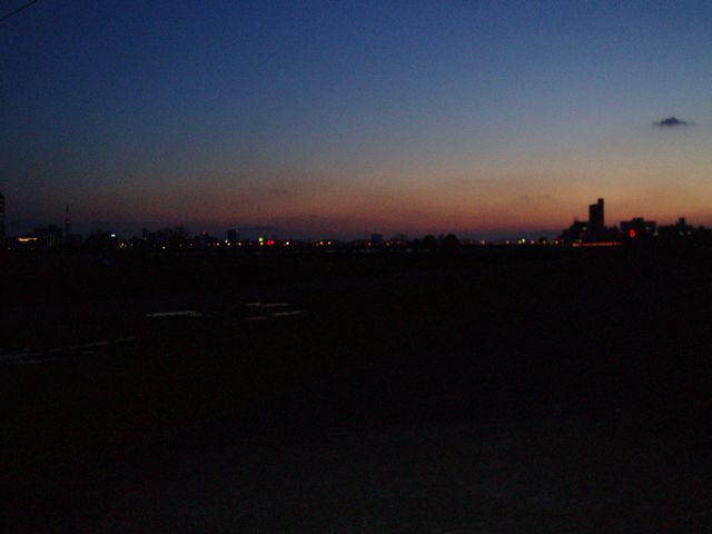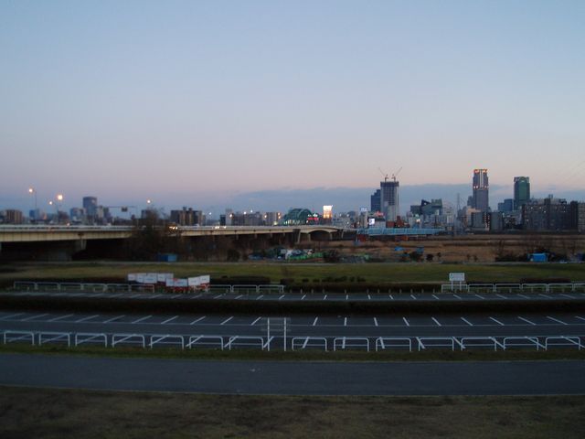 河川敷到着。既に夕方。奥に見えるのは梅田の街。
